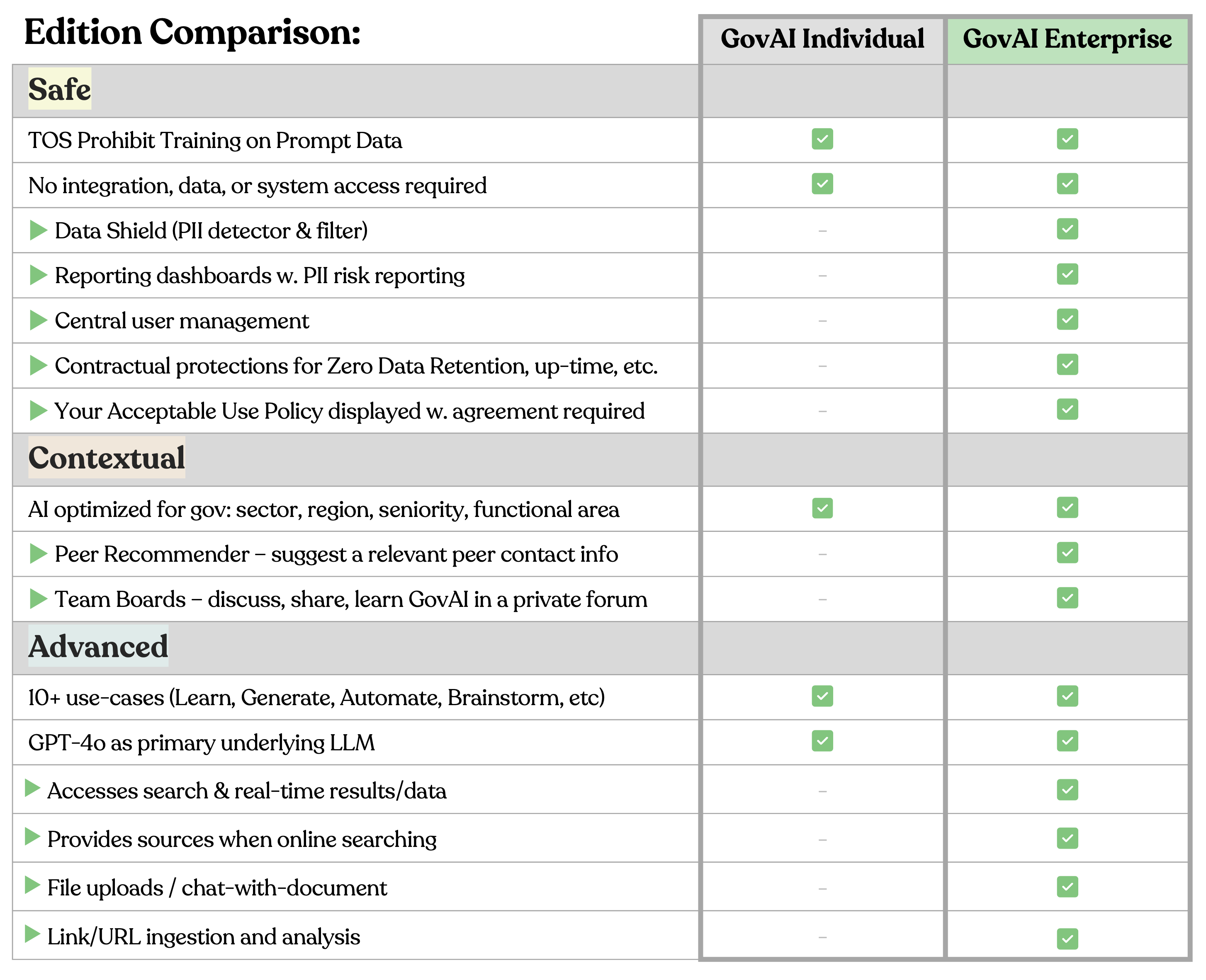 GovAI Enterprise is our paid product tier for government agencies that wish to deploy GovAI across their organizations, and want central user management, visibility/reporting, and fine-grained policy and data controls for their users.
